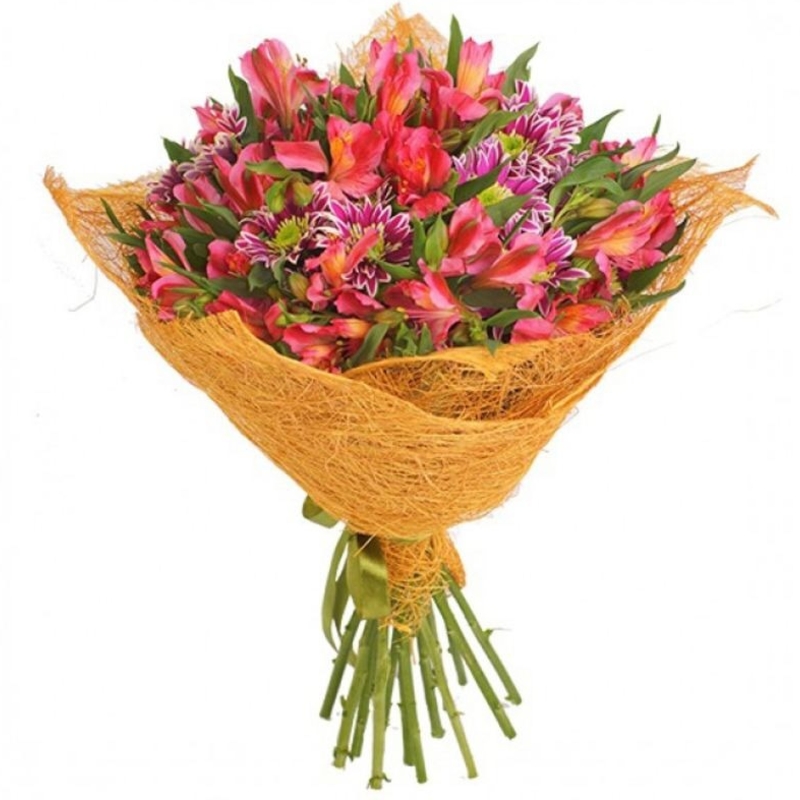 Букет состоит из 5 веток альстромерии, 4 ветки хризантемы, зелень, красивая упаковка, атласная лента.