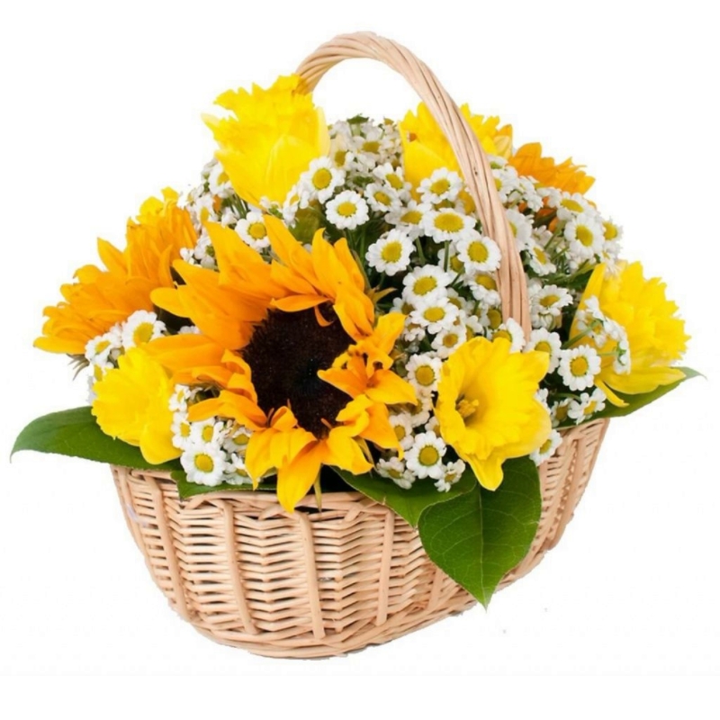 Букет состоит из 3 подсолнуха, 5 нарциссов, 7 веток ромашек, зелень, корзина, оазис.
