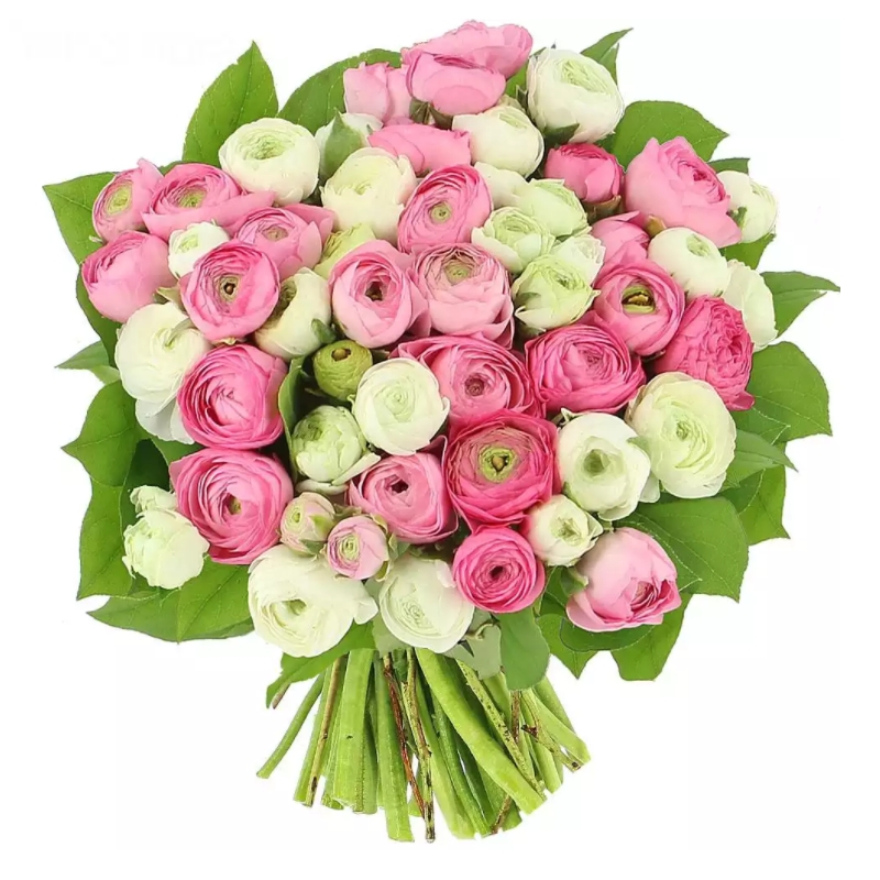 Букет состоит из MIX из 51 белого и розового ранункулюса, зелень, прозрачная упаковка, атласная лента.