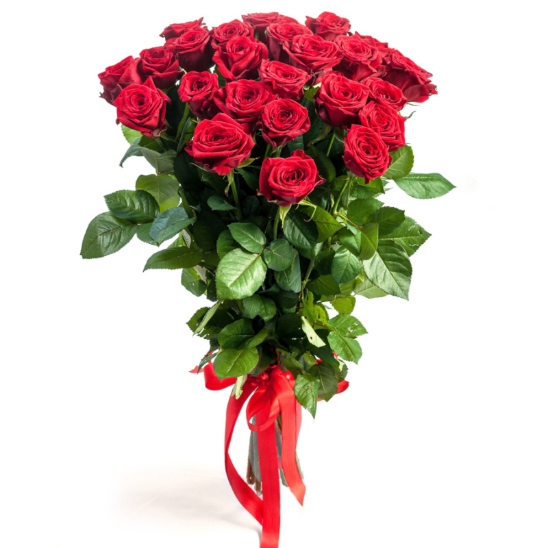 Букет состоит из 25 красных роз, прозрачная упаковка, атласная лента.